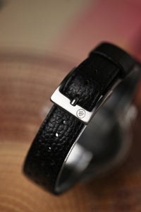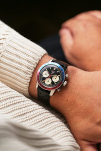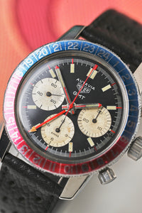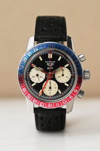 Enter the Autavia GMT. It takes Heuer’s bread-and-butter racing chronograph formula and adds a travel-friendly GMT complication. This example has survived in its correct configuration: the “Swiss Only” dial shows minor staining on the subdials, the tritium hour markers have mellowed into a pale cream, and the bezel has aged into a wonderfully faded aquamarine-and-red split that just screams character. The correct fluted pushers, crown, and compressor snap-back case complete the package, with those subtle details that mark its generation.
