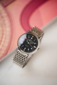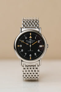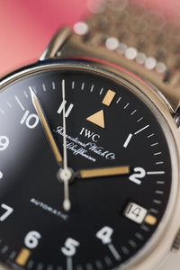 The present watch, reference IW351315, dates to 1997 and features a refined 34 mm case with a matte black dial. The tritium lume on the markers and hands has aged to a rich pumpkin tone, providing beautiful contrast. It is fitted with the original IWC bead-of-rice bracelet, which wears exceptionally well on the wrist. Both case and bracelet show only minimal wear. The bracelet currently fits a 17 cm wrist, with additional links available from IWC if needed.