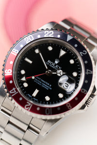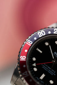 The 16710 directly succeeded the 16760, reintroducing a slimmer case while retaining the Caliber 3185 movement. Early 16710s were fitted with tritium dials, in line with the earlier GMT-Master models. Between 1997 and 2000, like most Rolexes of the era, the dials transitioned from tritium to Luminova and then to Super-Luminova, indicated by the changing “SWISS” and “SWISS MADE” signatures at six o’clock. The present watch is a transitional “SWISS MADE” example, paired with a lug-hole case that allows for easy strap changes.